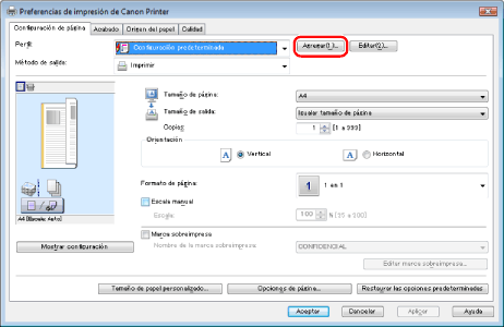 Si no puede seleccionar un perfil, muestre el cuadro de diálogo de propiedades de la impresora en [Panel de control], haga clic en la ficha [Perfil] y, a continuación, compruebe si se encuentran seleccionadas las opciones [Permitir la selección de perfiles] y [Permitir la edición de la configuración]. Para conocer las instrucciones acerca de cómo mostrar el cuadro de diálogo de propiedades de impresora, consulte "Configuración de las opciones de impresora".