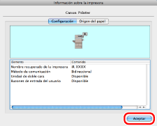 Si no se corresponde el nombre del controlador de la impresora que se muestra en la parte superior del cuadro de diálogo [Información de la impresora] con el nombre de la impresora que se muestra como [Nombre recuperado de la impresora], es posible que no pueda utilizar las funciones de la impresora correctamente. Si los nombres no se corresponden, elimine la impresora que ha añadido en [Preferencias del Sistema] y vuelva a añadirla. Para obtener información detallada, consulte la Printer Driver Guide (consulte " Instalación").