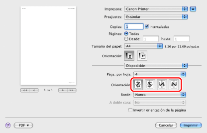 Seleccione su impresora → [Disposición] → el número de páginas que desea imprimir en una misma hoja de papel en [Págs. por hoja].