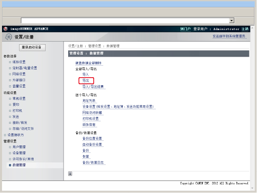 如果使用“全部导入”功能导入“部门识别码管理设置”,系统管理员信息设置(如识别码或密码)就会被覆盖。使用“全部导出”功能之前,检查导出机器的系统管理员信息,因为登录到导入的接收方机器时会用到。