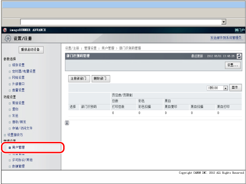 如果本机已安装“复印读卡器-F1”,将自动设置“部门识别码管理”。如果已安装“复印读卡器-F1”,则不会显示[注册新部门]和[删除部门]。