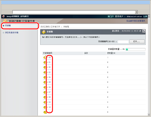 单击[访问已接收/已存储文件]→选择[存储箱]→单击所需存储箱的编号。