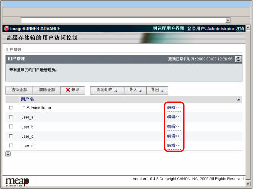 只有“高级存储箱”管理员可以在[高级存储箱的用户访问控制]的[用户管理]页面上注册/编辑用户信息。普通用户只能更改自己的密码。(请参阅“以普通用户身份编辑用户信息”)