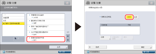 通过将[包含传真接收方时限制多路发送]设置为“打开”,可以限制多路发送。利用该模式,可以通过限制将传真发送到多个接收方来防止将传真发送到错误的号码。