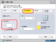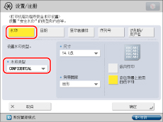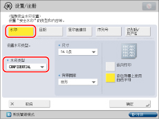 如果要从打印机驱动程序对每项作业使用“安全水印”功能,在[打印首选项]对话框上,单击[完成方式]选项卡→[高级设置]→为[设备的保密打印功能]选择[打开]。有关详细信息,请参阅打印机驱动程序的在线帮助。