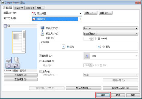 通过指定“控制面板”(不是应用程序中)上的打印机驱动程序屏幕中的打印设置,可以将这些设置注册为默认设置。对于Windows XP,要在操作面板中显示打印机驱动程序屏幕,请单击[开始]→[打印机和传真](或[开始]→[控制面板]→[打印机和其他硬件]→[打印机和传真])→右键单击打印机图标→单击[打印首选项]。对于Windows Vista,单击[