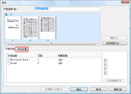 显示[Canon PageComposer]对话框。组合的文档显示在文档列表上。