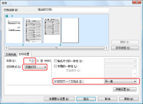 [份数]选择[5],[打印样式]选择[双面打印]。