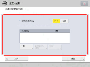 (设置/注册)→[功能设置]→[发送]→[电子邮件/互联网传真设置]→[限制发送接收方域]。