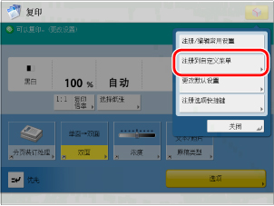 如果在“自定义菜单”中注册常用功能设置(如“复印”、“扫描后发送”和“扫描后存储”),也可以在其他机器上使用这些设置。