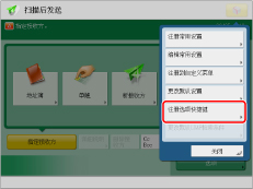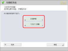 “扫描后发送”屏幕上显示两个选项快捷键。[双面原稿]和[不同尺寸原稿]显示为默认设置。这些快捷键可以更改为常用的功能。