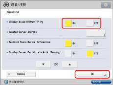 按[Security](安全)→为<Display Mixed HTTPS/HTTP Pg>(显示HTTPS/HTTP混合网页)选择[On](打开)→按[OK](确定)。