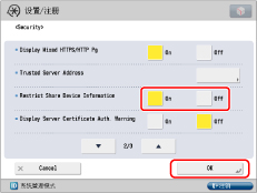 如果<Restrict Share Device Information>(限制共享设备信息)设置为“On”(打开)并且<Trusted Server Address>(受信任的服务器地址)中未设置任何内容,则处理任何地址的请求时都不附加设备信息。
