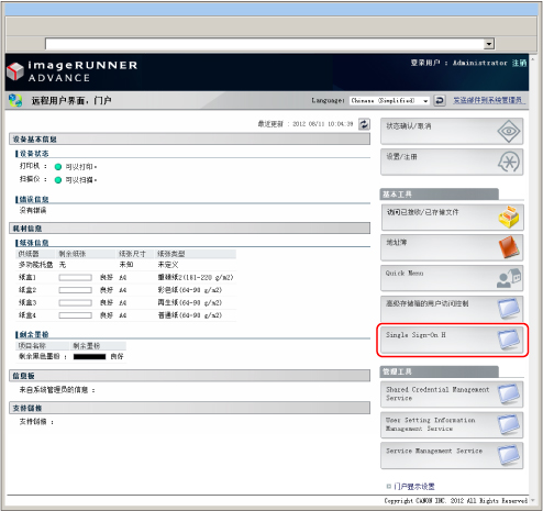 要从“远程用户界面”的门户页面登录,将“设置/注册”的[管理设置]的[许可协议/其他]的[远程用户界面]设置为“打开”。(请参阅“启动远程用户界面之前”)