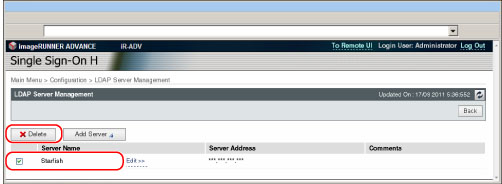单击[LDAP Server Management](LDAP服务器管理)时,显示屏幕切换到[LDAP Server Management](LDAP服务器管理)屏幕,同时存储[Configuration](配置)中的设置。