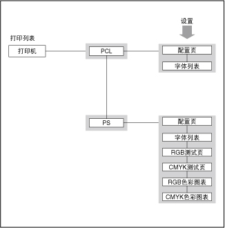 利用“打印机设置”菜单可以访问常规功能。下面是“打印机设置”菜单结构的简化框图。