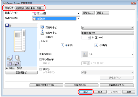 单击[页面设置]、[完成方式]、[纸张来源]和[质量]选项卡,然后指定所需的项目。