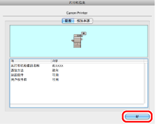 如果显示在[打印机信息]对话框顶部的打印机驱动程序名称与[从打印机检索的名称]显示的打印机名称不一致,则可能不能正确使用打印机功能。如果名称不一致,删除在[系统预置]中添加的打印机并重新添加。有关详细信息,请参阅打印机驱动程序指南(请参阅“ 安装”)。