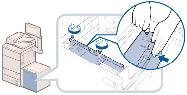 如果拧紧蓝色螺钉时不向内按住内侧尺寸更改板,则可能将内侧尺寸更改板倾斜固定。如果使用内侧尺寸更改板倾斜的纸仓,可能会倾斜地输送纸张,可能导致打印质量不佳并发生卡纸。因此,请确保在拧紧蓝色螺钉的同时向内按住内侧尺寸更改板。