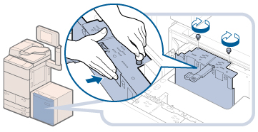 如果拧紧蓝色螺钉时不向外按住外侧尺寸更改板,则可能将外侧尺寸更改板倾斜固定。如果使用外侧尺寸更改板倾斜的纸仓,可能会倾斜地输送纸张,可能导致打印质量不佳并发生卡纸。因此,请确保在拧紧蓝色螺钉的同时向外按住外侧尺寸更改板。