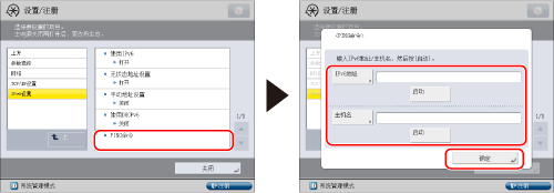 要核对主机名:按[主机名]→输入本机的主机名→按[启动]。触摸面板显示屏幕上显示执行PING命令的结果时,按[确定]。