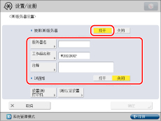 如果将<WINS解析> 设置为“打开”并在[SMB服务器设置]中同时设置了[服务器名]和[工作组名称],即使将<使用SMB服务器>设置为“关闭”,仍会启用WINS名称注册功能。