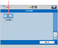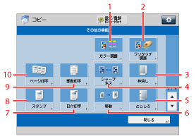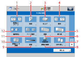 を押して画面を切り替えることができます。この画面にはコピーで利用できる応用機能が表示されます。