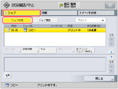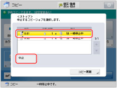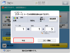 コピー中、または待機中に表示される画面の[中止]を押すと、コピー中のジョブや一番最後に原稿を読み込んだ待機中ジョブを中止できます。
