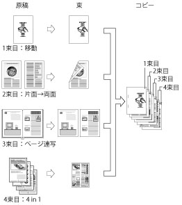結合したジョブ束全体を試しプリントします。各ジョブ束とジョブ束全体に設定したコピーモードでプリントされます。