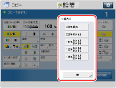 コピー(クイック)画面では、設定項目がポップアップ表示画面で表示されることがあります。ポップアップ表示画面を閉じるときは、[OK]を押します。