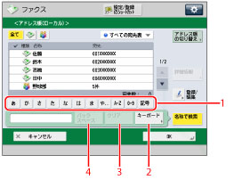 [あ]、[か]、[さ]などの目次キーを押すと、その行の文字([あ]であればあ行)をポップアップ画面で表示します。ポップアップから選択すると、その文字でさらに絞り込みます。[全て]を押すと、絞り込まれた結果がクリアされて全ての宛先を表示します。