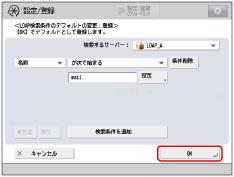 (設定/登録)を押すと、入力値が埋まった状態で<LDAP検索条件のデフォルトの変更:登録>画面が表示されるので、[OK]を押します。