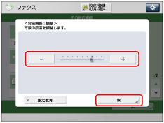 <背景調整>で[調整]を押して調整値を変更すると、[自動]の設定は解除されます。また、[調整]で濃度調整をしているときに[自動]を押すと、調整値は解除され、下地の画質を自動的に調整します。