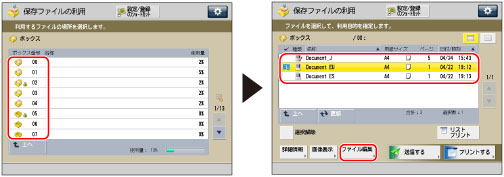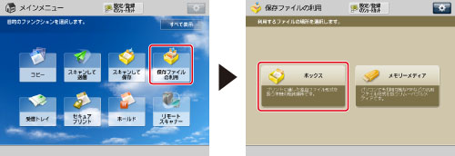 (メインメニュー)→[保存ファイルの利用]→[ボックス]を押す