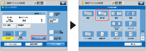 用紙をインサーター・M1から給紙する場合は、[インサーター1]または[インサーター2]を選択します。先行しているジョブがインサーター・M1を使用しているときは、[インサーター1変更予約]または[インサーター2変更予約]で仕切紙に使用する用紙を選択できます。
