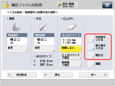 中表紙、中ウラ表紙、挿入紙のうち、1つの用紙サイズを他と異なる用紙サイズに変更すると、自動的に残りの2つの用紙サイズも変更されます。ただし、同じ用紙サイズで用紙カセットだけを変更したときは、残りの2つの用紙サイズは変更されません。