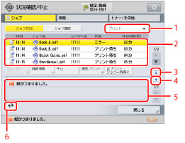 リスト下部に表示されるボタンを押して、ジョブのプリント優先順位の変更、ジョブの中止、ジョブの 詳細情報の確認などを行うことができます。 リスト下部に表示されるボタンは、ジョブ種類によって異なります。ジョブ状況画面で表示されるボタ ンの詳細については、「ジョブ画面アイコン一覧」を参照してください。 |