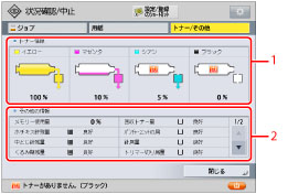 トナー/その他画面を表示します。トナー/その他画面では、トナー残量や、消耗品の残量および屑量を確認できます。トナー/その他画面の詳細については、「トナー/その他画面」を参照してください。