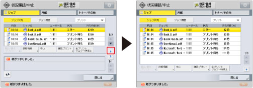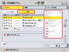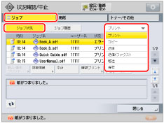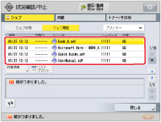 画面左端に表示されるアイコンで、ジョブ状況を判断できます。アイコンの種類と詳細については「ジョブ画面アイコン一覧」を参照してください。