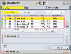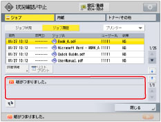 [ファンクション設定](設定/登録)の[ジョブ中断時のタイムアウト]を「ON」に設定している場合は、ジョブの中断から設定した時間が過ぎると、中断したジョブが用紙なし中断中ジョブとして表示されます。用紙なし中断中ジョブを再開するには、用紙を補給して、ジョブを選択したあと、[詳細情報]→[再開]を押してください。
