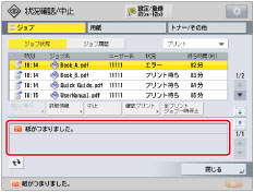 ジョブを受け付けたときに指定した用紙がない場合は、用紙の補給を促すメッセージが表示されます。用紙を補給して、ジョブを再開してください。