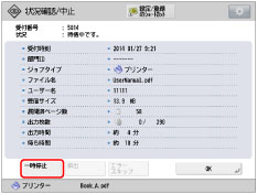 [ファンクション設定](設定/登録)の[ジョブ中断時のタイムアウト]を「ON」に設定している場合、設定した時間が過ぎると、中断したジョブが用紙なし中断中ジョブとして表示されます。用紙なし中断中ジョブを再開するには、用紙を補給して、ジョブを選択したあと、[詳細情報]→[再開]を押してください。