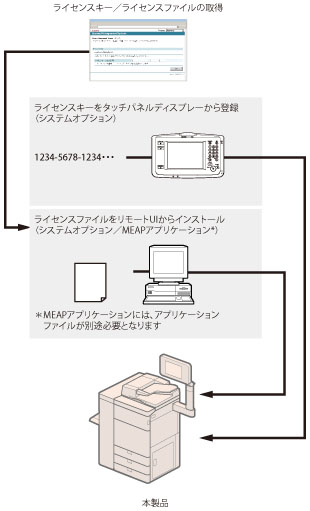 「ソフトウェアの登録/更新」の機能を使って、システムオプション/MEAPアプリケーションを本製品にインストールできます。