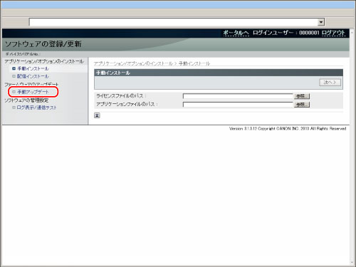 リモートUI のトップページから、[設定/登録]→[ライセンス/その他]→[ソフトウェアの登録/更新]をクリック