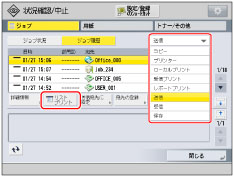 ファクス通信管理レポートの送信履歴をプリントする場合は、ドロップダウンリストで[送信(ファクス)]を選択します。(→ファクス通信管理レポート)