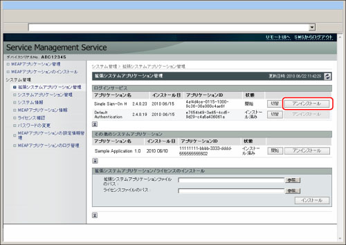 Default Authentication(部門別ID 管理)と、使用中のログインサービス(状態が「再起動後停止」と表示されているログインサービス)、次回本体を起動したときから使用するログインサービス(状態が「再起動後開始」と表示されているログインサービス)は、アンインストールできません。