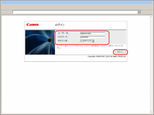 工場出荷時は、ローカルデバイス認証の管理者のユーザー名が「Administrator」、パスワードが「password」になっています。(大文字と小文字の区別をします。)