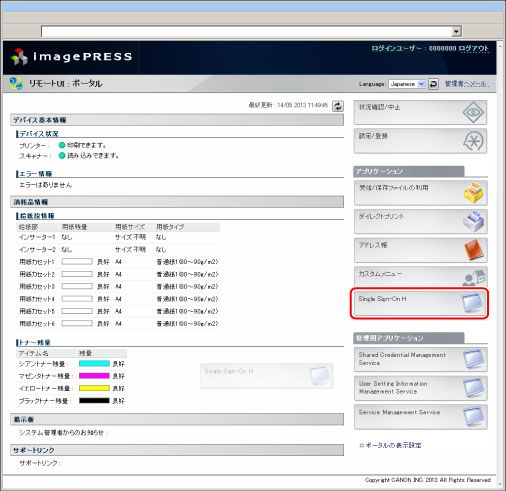 Remote UI Portalからログインするには、[管理設定](設定/登録)にある[ライセンス/その他]の[リモートUIのON/OFF]を「ON」にしてください。(→リモートUIを起動する前に(準備))