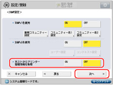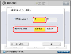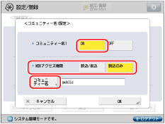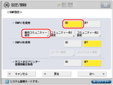 <SNMPv1を使用>の[ON]→[専用コミュニティー設定]を押します。<専用コミュニティー>の[ON]→<MIBアクセス権限>の[読込/書込]を押します。