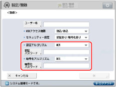 <暗号化アルゴリズム>ドロップダウンリストから[DES]または[AES]を選択したあと、[暗号化パスワード]を設定します。